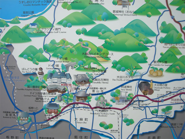 | 橋の手前には、大麻比古神社 の案内看板がある。 ドイツ橋、めがね橋 に行かれる方は この地図も参照 ※ 地図 左下に ドイツ館があるが、旧 ドイツ館があった 場所であり、現在の ドイツ館の場所では ない ので ご注意下さい。BANDOロケ村 の記述もないです。 ※ 案内看板は 日々変化している可能性もありますので ご注意下さい。(写真撮影 時点だとお考え下さい) |