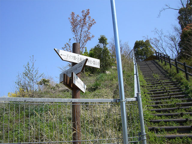 | 散策路 出入口 先 階段 手前 分岐点に 上記様な各方面への案内があります。 ドイツ兵の慰霊碑/墓 または ドイツ村公園へ 行かれる方は この分岐点で 案内されてる方面へ ドイツ兵の慰霊碑/墓 のみ 見られる方は、この場所に 戻って来る。または この機会に ドイツ村公園 を見てから その後 ドイツ村公園 横から 広い道にでて 広い道から ドイツ館 方面へ 移動する方法もある。 ※ ドイツ村公園 まで 行かれる方は、広い道から行く方が 同じ場所に戻ってくるよりは 上り 下り がないので 距離的には 近いと思われます。 ※ 最後の方に、大まかな位置関係の地図を表示しています。 |