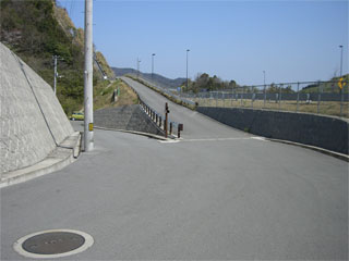 | 道路 正面 上方面に 約0.4キロ ぐらいすすむと 橋手前の 分岐点に到着する。 |
