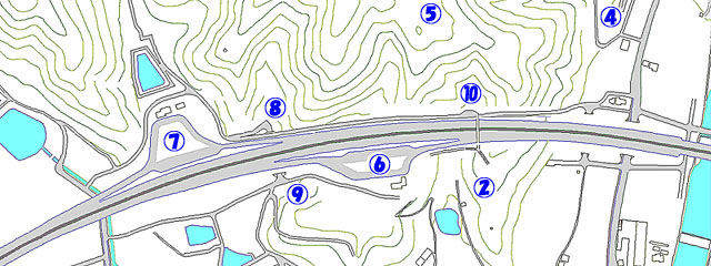| A ドイツ兵の慰霊碑 / ドイツ兵の墓 C 鳴門市ドイツ館 鳴門市賀川豊彦記念館 D ばんどうの鐘 (こちら方面という意味で表示。地図上 手前で表示してます) E 鳴門西PA 高松方面 F 鳴門西PA 神戸方面 G H 高速道路 下 トンネル入口 I 分岐点 I と A の間が ドイツ村公園跨道橋 |