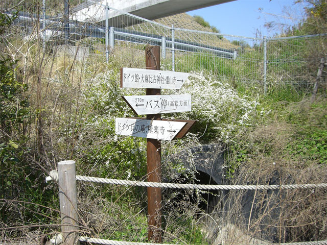 | I の場所 で撮影 分岐点 各方面への分岐点 (逆 パーキングエリアからの合流地点) ばんどうの鐘 ドイツ館 大麻比古神社 霊山寺 ドイツ村公園 ドイツ兵の慰霊碑/墓 極楽寺 等々 各方面 高速バス のりば も この分岐点から行くことが可能 |