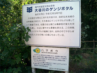 | 鳴門市指定天然記念物 大谷川のゲンジボタル 指定年月日 平成10年9月11日 大谷地区を南北に流れる大谷川は、良好な水流域の自然環境が 保たれ、その清流にゲンジボタルが生息していて貴重である。 初夏の発生期には青緑色の蛍光を発して乱舞し、水辺に華やかな 景観を添える。この時期、多くの人々がホタルの鑑賞に訪れ、 自然の中でやすらぎを求める人たちの憩いの場にもなっている。 |