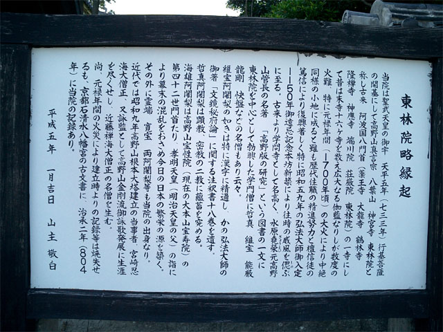 | 東林院略縁記 当院は聖武天皇の御宇 天平五年(733年)行基菩薩の 開基にして高野山真言宗 八葉山 神宮寺 東林院と 称し古来 阿波国八門首(薬王寺 神宮寺 鶴林寺 隆禅寺 神應寺 端川院 荘厳院 東林院)の一寺にし て昔は末寺十六ヶ寺を数え広大なる伽藍なりしが数度の 火難、特に元禄年間(1700年頃)の大火により中絶 同様の小地に成ると雖も歴代住職の精進努力と檀信徒の 篤信により復興著しく特に昭和59年の弘法大師御入定 1150年御遠忌記念本坊新築により往時の威風を偲ぶ に至る。古来より学問寺として名高く、水原堯榮元高野 山管長の名著「高野版の研究」という図書の一文に 東林院を中心として勃興した学門僧にに哲真 維宝 能厳 龍剛 快盤などの名僧もあり云々。 維宝阿闍梨の如きは特に漢字に精通し、かの弘法大師の 御著「文鏡秘府論」に関する注釈書十八巻を遺す。 哲真阿闍梨は顕教、密教の二教に蘊蓄を究める。 海雄阿闍梨は高野山宝性院(現在の大本山宝寿院)の 第四十二世門首たり、孝明天皇(明治天皇の父)の詣に より幕末の混乱をおさめ今日の日本の繁栄の源を築く。 その外に霊端 寛宝 両阿闍梨等も当院の出身なり。 近代では昭和九年高野山根本大塔建立の当事者、宮崎忍 を尽くせし、近藤禅海大僧正の名僧を生む。 尚、元禄年間の火災により建立時よりの記録等は焼失せ るも、京都石清水八幡宮の古文書に、治承二年(804年)に 当院の記録あり。 平成五年1月吉日 山主敬白 と書かれている |