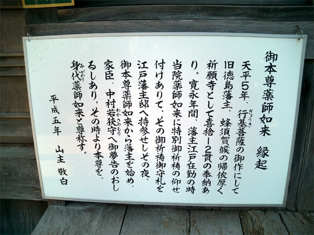 | 御本尊薬師如来 縁起 天平5年、行基菩薩の御作にして 旧徳島藩主、蜂須賀候の帰依厚く 祈願時として喜捨12貫の奉納あ り。寛永年間、藩主江戸在勤の時 当院薬師如来に特別御祈祷の仰せ 付けありて、その御祈祷御守礼を 江戸藩主邸へ持参せしその夜、 御本尊薬師如来から藩主を始め、 家臣、中村若狭守へ御夢告のおし るしあり。その時より本尊を、 身代薬師如来と尊称す。 平成五年 山主敬白 と書かれている |